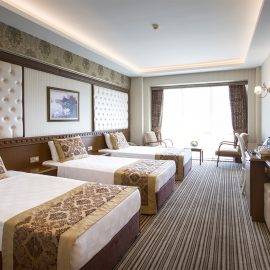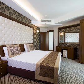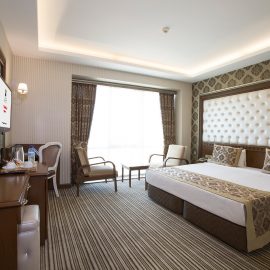 Bu odalarda kullanışlı ve modern bir tasarım bulunmaktadır. Geniş bir yatak size rahat bir uyku deneyimi sunar, çalışma masası işlerinizi halledebilmeniz için uygun bir alan sağlar. Ayrıca, değerli eşyalarınızı güvenli bir şekilde saklayabileceğiniz bir kasa da mevcuttur.